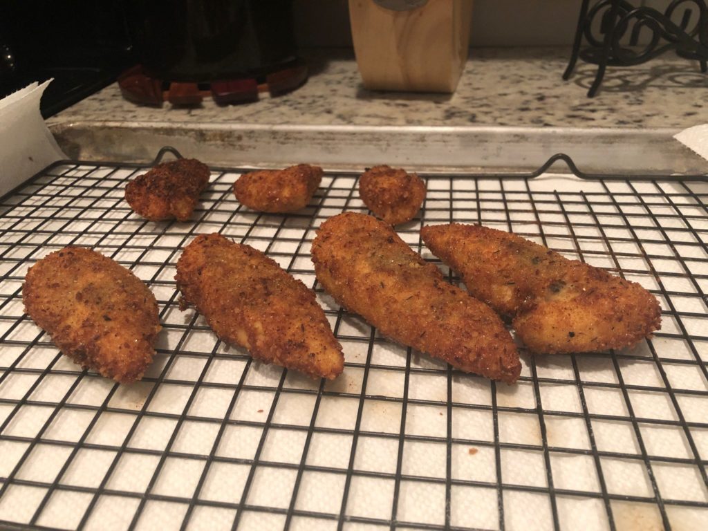 Place the chicken strip on a cookie sheet covered with parchment paper to dry for a few minutes or refrigerate for a few hours before cooking in hot oil.