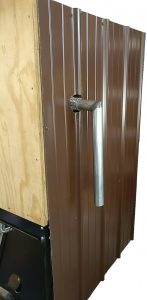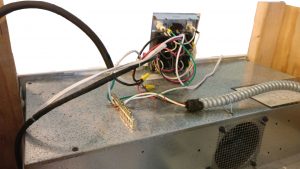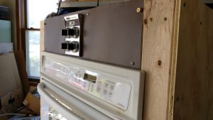 I added an access panel to get to the wiring without disassembling the cabinet. The brown metal behind the controls is aluminum and comes in 10″ x 10ft rolls and is white on one side and brown on the other. I think I paid about 12 bucks at Lowes for the roll.